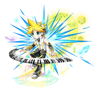 | A songster who appeared from another world. Though his physical appearance strongly resembled that of songstress Rin, they were actually not related by blood. However, they did possess a strong friendship that shone brightly on stage when they performed together. Using his new and improved musical instrument, Len left his audiences in awe as his fingers delivered note after note full of raw, powerful emotion. And when his smooth voice was complimented by Rin's on stage, it gave their music life before their audience's very eyes. Many of those who had suffered unbelievable hardships during the war in Grand Gaia found great comfort in this duo's music. | |